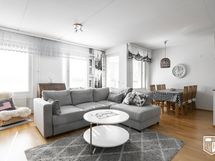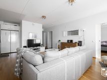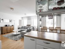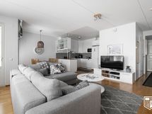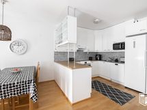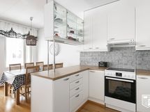 - Keittiö avautuu ruokailutilaan ja olohuoneeseen. Varusteina on vuonna 2022 uusitut Samsungin jääkaappi ja pakastin, vuonna 2021 uusittu keraaminen liesi, astianpesukone ja liesituuletin.