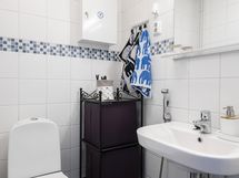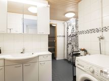 - Tilava, siisti kylpyhuone. Varusteina on suihku, wc-istuin, pesuallas, kylpyhuonekaapisto, peilikaappi ja pesukoneliitäntä.