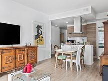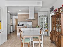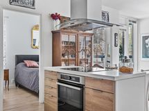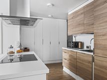 - Jääkaappi/pakastin, kaapistot, saareke, jossa uuni ja induktioliesitaso, liesikupu/-tuuletin