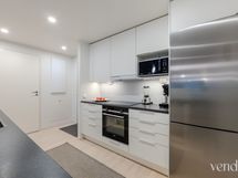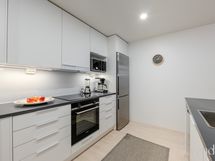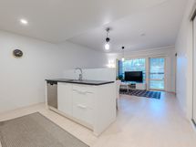 Keittiön varusteet: Jääkaappipakastin, uuni, liesi, astianpesukone ja keittiösaareke. Liesi: Induktioliesi. Työtason materiaali: Laminaatti.
