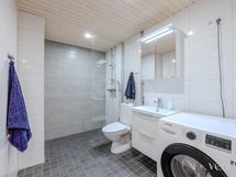 Pesutilojen varusteet: WC-istuin, suihku, suihkuseinä, pesukoneliitäntä, lattialämmitys, peilikaappi, peili, pesuallas, allaskaappi ja bidee-suihku.
