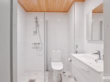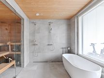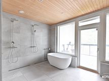 Yläkerran kylpyhuoneen varustus: 2 x sadesuihku, amme, käsisuihku, lattialämmitys.