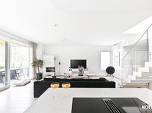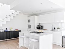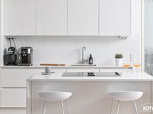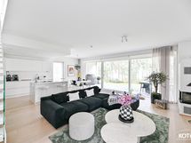 Seinäpinnat: lasi ja maali. Työtasot: kvartsitasot. Kauppaan kuuluva varustus: jääkaappi, pakastin, induktioliesi (liesituulettimella), astianpesukone, mikroaaltouuni ja kiinteät valaisimet.