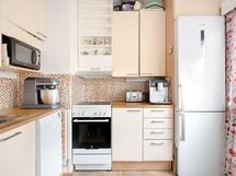 - Kaapistot, sähköliesi, jääkaappi/pakastin, astianpesukone , työtasoissa tummia jälkiä, liesikupu/-tuuletin
