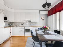 - Keittiön varusteet: Jääkaappipakastin (2kpl), astianpesukone ja liesituuletin. Liesi: Keraaminen liesi. Työtason materiaali: Laminaatti. Ovet uusittu v.2024.