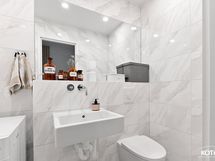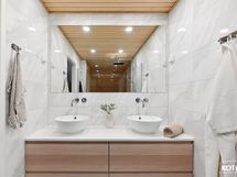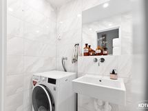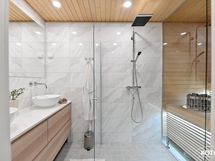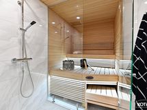 - Pesutilojen varusteet: Lattialämmitys, suihku, suihkuseinä, allaskaappi (x 2), peili ja pesuallas (x 2). Pesutilojen kuvaus: Kylpyhuone uusittu kokonaisuudessaan vuonna 2021. Erillisten WC:n lukumäärä: 1. Erillisen WC:n varusteet: WC-istuin (seinä wc), lattialämmitys, peili, pesuallas, lattiakaivo, pesukoneliitäntä ja allaskaappi.
