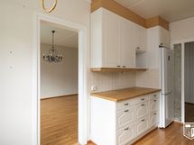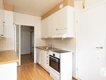 - Kaapistot, laminaattitasot. Samsungin jääkaappipakastin. Gramin keraaminen liesi. Siemensin astianpesukone. Liesituuletin. Lattia laminaattia.