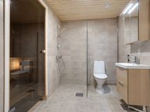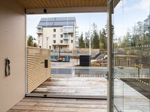 Saunallinen alimman kerroksen mukavankokoinen kaksio, jossa on osittain lasitettu iso terassi ja pieni nurmikkoalue. Selkeäpohjainen asunto on helppo sisustaa mieleisekseen. Keittiö on olohuoneen yhteydessä omassa kulmauksessaan, ja siellä on jääkaappipakastin, keraaminen liesi, astianpesukone sekä tilavaraus mikrolle. Kylpyhuoneessa on oma sauna sekä tilavaraus pyykinpesukoneelle ja pesutornille. Asuintilojen lattiat ovat laminaattia, ja kylpyhuone sekä erillinen wc on laatoitettu.