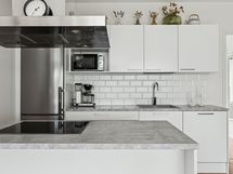 Yläkerrassa, joka toimii sisääntulokerroksena, sijaitsevat kodin päätilat. Olohuone, ruokailutila ja upea keittiö muodostavat kodin sydämen. Näyttävä saareke kutsuu kokkaamaan ja kokoontumaan. Samassa kerroksessa on myös makuuhuone vaatehuoneella sekä toinen kylpyhuone, mikä tekee arjesta erityisen sujuvaa. Olohuoneen puupaneloitu seinä, vankat betoniportaat ja tyylikkäät akustiikkalevyt muodostavat kokonaisuuden, jossa korostuvat kodin tarkasti harkitut yksityiskohdat ja ajaton tyyli. Yläkertaan on asennettu ilmalämpöpumppu, joka tuo raikasta viilennystä kesähelteillä ja lisää asumisen mukavuutta.