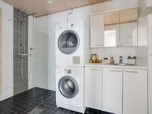 - Pesutilojen varusteet: Suihku, suihkuseinä, pesukoneliitäntä, lattialämmitys, peilikaappi, pesuallas, allaskaappi, bidee-suihku ja wc-istuin. Pesutilojen kuvaus: Isossa kylpyhuoneessa on tilaa pesutornille ja hyvin kaappitilaa. Kylpyhuoneessa on iso allaskaappi, peilikaappi sekä pyykkikaappi. Lattia on laatoitettu ja seinät kaakeloitu, mukavuutta lisää lattialämmitys.