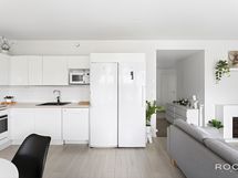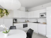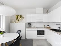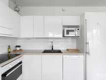 - Työtason materiaali: Laminaatti. Valkoiset Puustellin kaapistot, korkea jääkaappi ja pakastinkaappi, astianpesukone, kalusteuuni, induktioliesi, liesituuletin, laminaattitasot, välitila laatoitettu, led-valot. Seinät maalattu, lattia laminaattia.