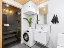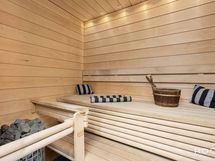 - Lumi saunojen muotolauteet, seinät leveää paneelia, led-valot. Harvian pilarikiuas.