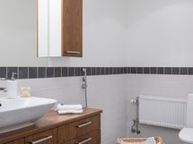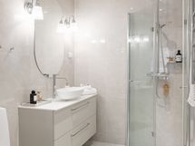 Seinät ja lattia laattaa. Allas, allashana, allaslaatikosto, peili, suihku, suihkuseinä ja wc-istuin. Sähkötoiminen lattialämmitys ja vesikiertoinen pyyhepatteri.