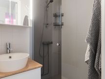 Kylpyhuone on siisti ja tilava, varustettu tyylikkäillä kalusteilla ja tilaa myös pyykinpesukoneelle.