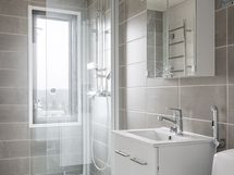 - Pesutilojen varusteet: Suihku, wc-istuin, suihkuseinä, pesukoneliitäntä, pesuallas, peilikaappi, allaskaappi ja lattialämmitys.