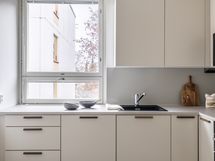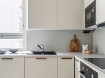 - Liesi: integroitu, induktio, erillisuuni. Työtasot: muu. Kylmäsäilytys: jääkaappi/pakastin. Varustus: liesituuletin, mikroaaltouuni, astianpesukone, kiinteät valaisimet. Tason materiaali Caesarstone Bianco Drift, paksuus 20mm.