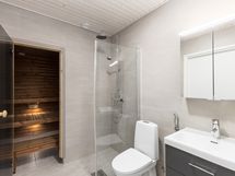 Seinillä ja lattioissa keraaminen laatta, katossa lämpökäsitelty mänty. Tasoallas, allaslaatikosto, peilikaappi, kääntyvä suihkuseinä, suihkusetti sadesuihkulla, wc-istuin, koukustot ja wc-paperiteline.