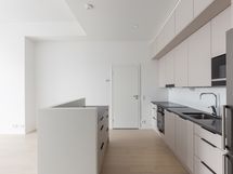 Puustellin keittiökaapit, –laatikot ja vetimet, kvartsikivityötaso, alta asennettu keittiöallas ja keittiöhana, jääkaappi ja kaappipakastin, induktiokeittotaso, kalusteisiin sijoitettu uuni ja mikroaaltouuni, liesikupu ulosvedettävällä lipalla, kalustepeitteinen astianpesukone. Välitilassa kiiltävä valkoinen lasi.