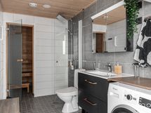 - Pesutilojen varusteet: Suihkuseinä, pesukoneliitäntä, bidee-suihku, lattialämmitys (Vesikiertoinen), wc-istuin, suihku ja peilikaappi.