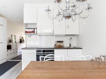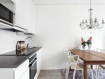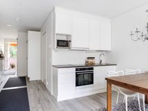 - Keittiön varusteet: Jääkaappipakastin, liesi ja astianpesukone. Liesi: Induktioliesi. Työtason materiaali: Laminaatti.