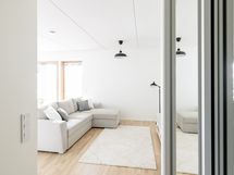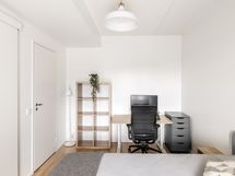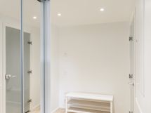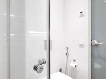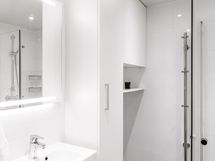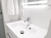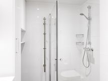 - Varusteet: kiinteät valaisimet, kylpyhuonekaapistot, WC, suihku, suihkuseinä, pesukoneliitäntä, lattialämmitys, allaskaappi, peili