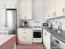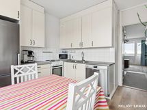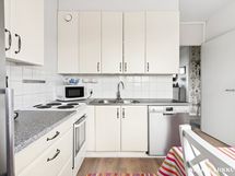 - Keittiön varusteet: Jääkaappipakastin, astianpesukone ja liesi. Työtason materiaali: Laminaatti.