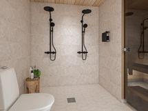 Saunaosaston löylyhuoneessa on laadukkaat lauteet ja sähkökiuas. Kylpyhuoneessa on kaksi suihkua. Kylpyhuoneen toisella laidalla on wc-istuin. Kodinhoitohuone-pukeutumistila on suunniteltu ja toteutettu käytännön kodinhoito- ja säilytystarpeet huomioon ottaen. Eteisessä on vaatekaapit vaatesäilytystä varten.