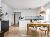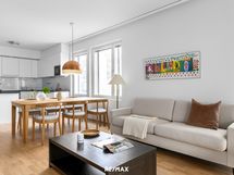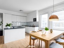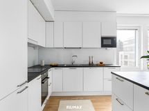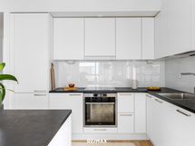 - Keittiön varusteet: Astianpesukone, liesi, erillinen pakastin, jääkaappipakastin, erillisuuni ja liesikupu. Liesi: Induktioliesi. Työtason materiaali: Laminaatti.