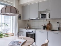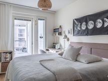 Keittiö on moderni ja selkeälinjainen, juuri sopivasti erillään mutta silti osa oleskelutilaa. Tyylikäs kokonaisuus toimii niin arjen ruoanlaitossa kuin ystävien kanssa kokkaillessa. Kaksi makuuhuonetta tarjoavat joustoa elämäntilanteeseen - toinen toimii mainiosti työ- tai vierashuoneena. Säilytystilat on mietitty fiksusti ja kokonaisuus tuntuu huolettomalta ja helposti omalta.