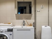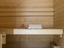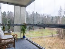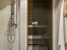 Kylpyhuone ja oma sauna tuovat arkeen ripauksen luksusta. Saunan pehmeät puupinnat kutsuvat rentoutumaan, ja kylpyhuoneessa on hyvin tilaa myös pyykkihuollolle. Lasitettu parveke on kuin lisähuone suurimman osan vuodesta - täällä on ihana nauttia aamukahvit tai rauhoittua päivän päätteeksi katse metsän suuntaan.