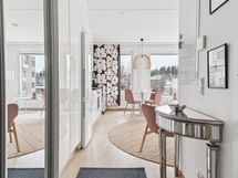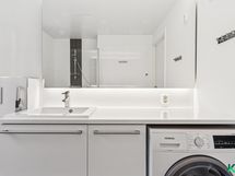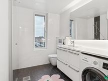 - Kylpyhuone, suihku/suihkuseinä, wc-istuin, peili,, kylpyhuonekaapisto, pesukoneliitäntä, lattialämmitys, kiinteät valaisimet