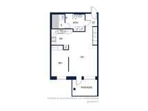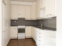- Vaaleat kaapistot, harmaat tasot, välitila harmaata laattaa. Keraaminen liesi. Liesikupu, jossa koneellisen ilmanvaihdon säätö. Astianpesukone. Jääkaappipakastin. Lattia parkettia.
