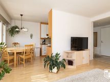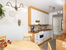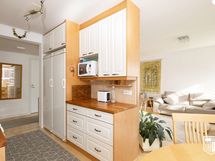 - Jääkaappi, pakastin, keraaminen liesi, astianpesukone, liesituuletin. Työtasot puuta, lattia parkettia.