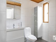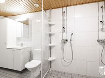 Kylpyhuone: Wc-istuin, pesuallas, allaslaatikosto, peilikaappi, suihku. Seinät ja lattia laattaa.