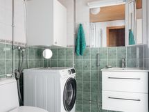 - Pesutilojen kuvaus: VARUSTUS: Suihku, suihkuseinä, wc-istuin, pesukoneliitäntä, pesuallas, peilikaappi, lattialämmitys ja allaskaappi.