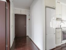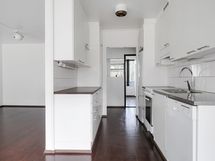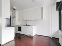 - Keittiön varusteet: Jääkaappipakastin, astianpesukone ja liesi. Työtason materiaali: Laminaatti. Valoisassa keittiössä valkeat kaapistot. Liesi, liesituuletin, astianpesukone, jääkaappi/pakastin. Keittiössä parkettilattia.
