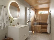 - Varusteet: WC, suihku, suihkuseinä. 2.krs tilava kylpyhuone Puustellin kalusteilla ja valopeili ROUND 800 iLED höyrynpoistolla. Kph:ssa pyykkikaappi ja siivouskaappi, sekä paikka pyykkikoneelle ja kuivausrummulle. WC: Erillinen wc 1.krs. Puustellin kalusteet valopeilillä. Varusteet: lattiaan asennettu WC, bidee, allaskaappi, peili