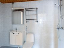 - Pesutilojen kuvaus: Allaskaappi, peilikaappi, korkea kaappi, puuhepatteri, bideesuihku.