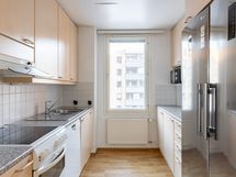 - Työtason materiaali: Laminaatti. Täysikorkeat jääkaappi ja pakastin, astianpesukone, liesi, uuni, liesituuletin.