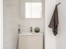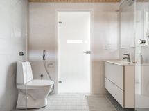 Pesutilojen varusteet: WC-istuin, suihku (Oras sadesuihku), suihkukaappi, pesukoneliitäntä, lattialämmitys, peilikaappi, pesuallas ja suihkuseinä (Lasinen). Erillisen WC:n varusteet: WC-istuin, lattialämmitys, peilikaappi, pesuallas ja bidee-suihku.