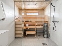 Kiuas: Sähkökiuas. Kuituvalaistus ja tervaleppä lauteet.