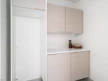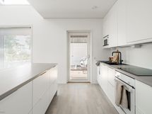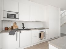 Keittiön varusteet: Erillinen pakastin, jääkaappi, astianpesukone, uuni ja mikroaaltouuni. Liesi: Induktioliesi. Työtason materiaali: Kvartsikomposiitti ja kvartsikomposiitti louhi metropolis beige, 30 mm. Keittiökalusteet ovat Puustellin. Intergroidut Siemens-kodinkoneet.