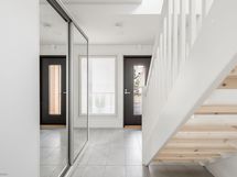 Eteisessä Pukkila Europe White 30×60 laatta ja Puustellin peililiukuovikaapisto