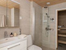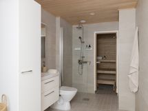- Pesutilojen kuvaus: Kylpyhuoneen varustukseen kuuluu sadesuihku, suihkuseinä, peilikaappi, allaskaappi, säilytyskaappi, tilaa pesutornille. Lattia ja seinät laatoitettu, katto paneloitu.