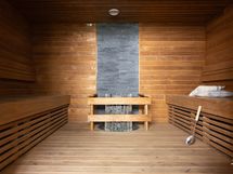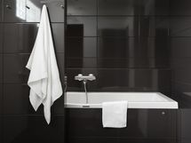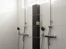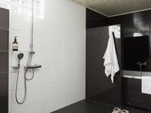 alakerta (sauna): 2x suihku, kylpyamme (Sähkövaraus poreammeelle). Erillisen WC:n kuvaus: Yläkerta: WC, bidee, peili, allaskaappi, laatta lattia, kaakeliseinät