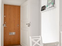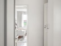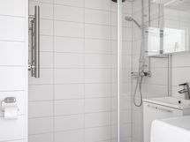 Lämminvesikiertoinen pyyheteline sekä olohuoneen seinän puolella luukku, jota kautta kautta taloyhtiön putket voi vaihtaa.