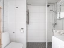 - Pesutilojen varusteet: WC-istuin, suihku, pesukoneliitäntä, peilikaappi ja suihkuseinä. Pesutilojen kuvaus: Allaskaapisto