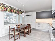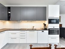 - Keittiön varusteet: Jääkaappi, erillinen pakastin, erillisuuni (Kiertoilmauuni), liesi, astianpesukone, liesituuletin ja mikroaaltouuni. Liesi: Induktioliesi. Työtason materiaali: Laminaatti.