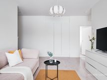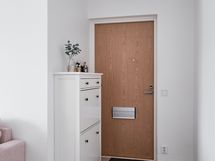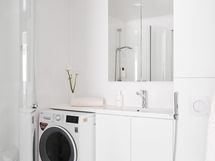 - Pesutilojen varusteet: WC-istuin, suihku, suihkuseinä, pesukoneliitäntä, lattialämmitys, peilikaappi, pesuallas, allaskaappi ja bidee-suihku. Pesutilojen kuvaus: Moderni pesutila, hyvin säilytystilaa ja paikka pesutornille.