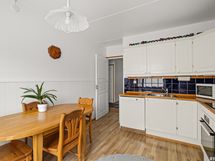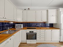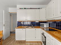- Keittiön varusteet: Jääkaappipakastin, uuni, liesi, liesituuletin ja astianpesukone. Liesi: Induktioliesi. Työtason materiaali: Puu.